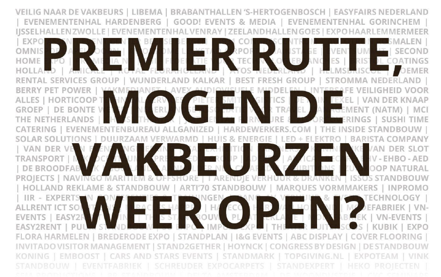 Update 9 juni 2020, 09.00 uur: Vandaag vragen wij – als aanjagers van de economie – op landelijke schaal aandacht voor de heropening van vakbeurzen in Nederland. Dit doen wij onder meer door twee paginagrote advertenties in het Financieel Dagblad en De Telegraaf, waarin wij de aandacht vragen van premier Rutte met de vraag: mogen […]