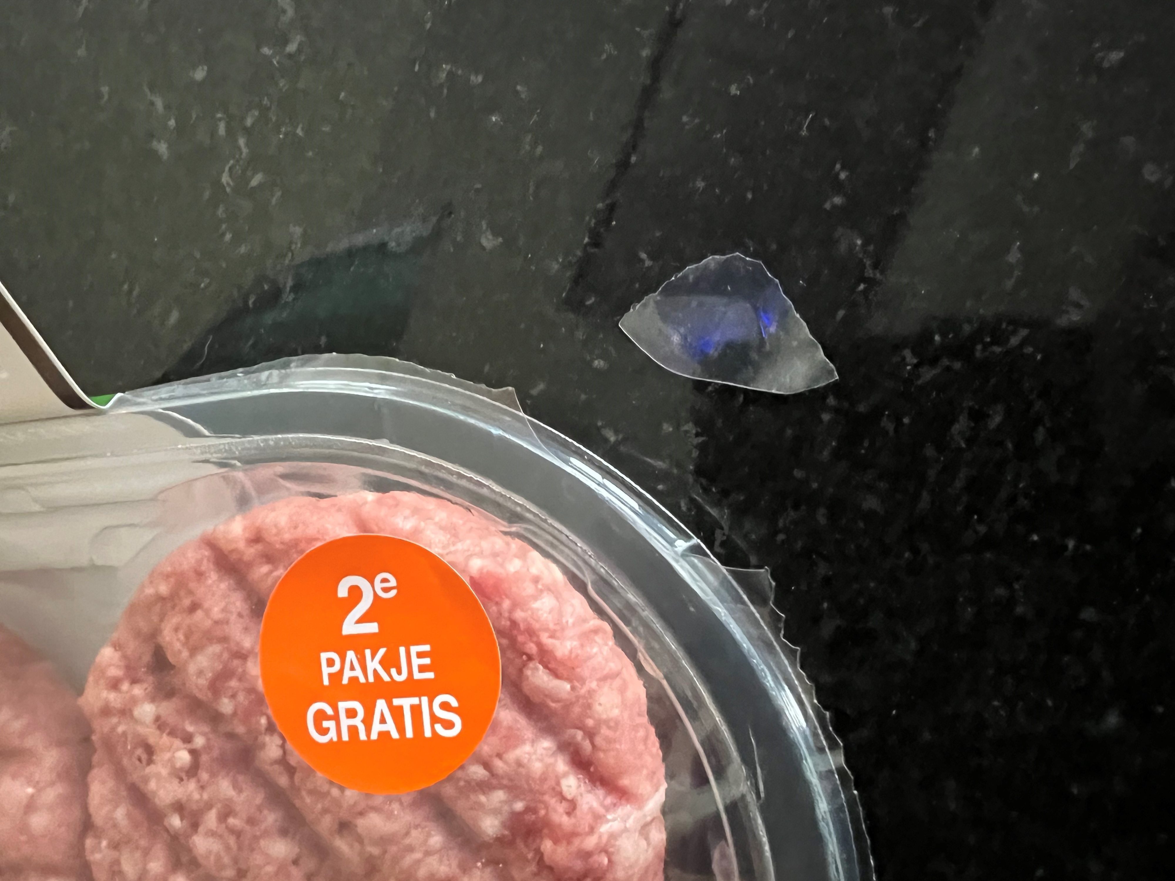 Er is wel wat op de verpakking aan te merken. Ik koos er nu voor om de burgers niet in de grill, maar in de pan te bakken. Ik laat het vet in de pan smelten en wil dan de verpakking openen. Het begint dan met de banderol. Die kan alleen verwijderd worden door deze los te scheuren. En dan blijft die ook nog vastplakken aan de verpakking. Deze zal vermoedelijk vastgelijmd zijn om te voorkomen dat de banderol gaat schuiven en ergens tijdens het transport van het verpakte product naar de plaats van verkoop gescheiden kan worden van de verpakking. Op zich begrijpelijk, maar voor de consument niet echt handig. Veel vervelender wordt het als blijkt dat de folie niet goed te verwijderen is van het bakje. Je trekt het lipje kapot. Niet bij een enkele, maar alle verpakkingen. Het vet begint te dampen en ik moet in tussen snel een schaar pakken om de verpakking te openen. Met de beefburgers kwam het goed, maar ik stond wel vertwijfeld naar de verpakking te kijken. De folie zit nog aan het bakje omdat deze niet de scheiden is van het bakje. Tevens zitten er delen van de banderol aan vast. Op de banderol staat dat deze bij het oud papier kan. Maar ik vraag me af welk percentage van de banderol daar terecht komt.