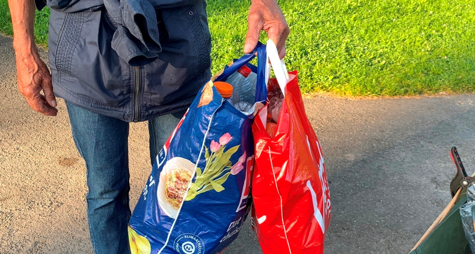 Toen ik daar bijna klaar was zag ik een man op leeftijd met twee boodschappentassen vol plastic flesjes de baan op lopen en precies daar kijken waar ik net veel had geraapt. “Zoek je statiegeldflesjes? Die heb ik al!” Hij lachte en zei: “Dat heb je goed gedaan, dan ga ik weer ergens anders kijken.”