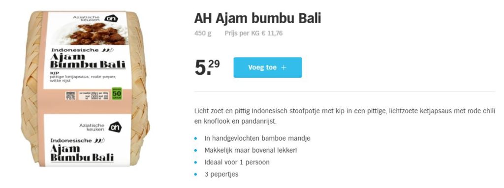 Ik herinner mij  een bepaalde verpakking op die alweer enige jaren op de markt is. Tijdens het schrijven heb ik op de site van de AH nagezocht of deze nog in het assortiment aanwezig was.  Ik kreeg een uitgebreide beschrijving over product en materiaal.  Het betreft een Aziatische magnetron maaltijd  welke met  2 hitte bestendige kunststof bakjes verpakt zitten in een 2-delig hand gevlochten bamboe mandje met daaromheen een sleeve om het geheel bij elkaar te houden.