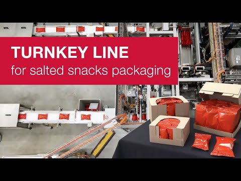 Find out more about our turnkey solutions for salted snacks in the video. In this example, 50g and 100g crisps are packed into pillow bags at speeds of up to 100 bags per minute per machine. Our systems allow flexible grouping into 2 or 3 rows with 5–8 bags per row, along with various final packaging options. In the video, you can see the bags being packed into wraparound cases (WA cases) at up to 20 cases per minute.