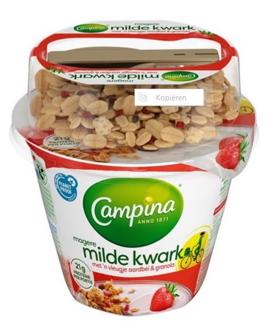 Het concept van een bekertje yoghurt of kwark met een toevoeging van muesli of granola is door veel verschillende zuivel merken uitgebracht. In de standaard varianten die te vinden zijn is de verpakking ingericht met een bekertje zuivel als basis. Dit bekertje is vaak voorzien van een (gedeeltelijk) aluminium seal. Daarnaast zit er een deksel op die vrij hoog is omdat daar de granola in afgevuld wordt. Deze deksel is aan de binnenzijde ook voorzien van een seal waardoor de zuivel en de granola niet al vermengd zijn. Maar hier komt het nieuwe concept. Normaal gesproken zit er een lepeltje in de deksel verwerkt, wat er dus uitgehaald moet worden na het openen van de deksel en voor het combineren van de granola en de zuivel. Bij de nieuwe variant van Campina is er in het ontwerp van de deksel een verlaging aan de bovenkant van de deksel gemaakt waar het lepeltje in verdwijnt. Dit gedeelte is vervolgens weer afgesloten met een gedeeltelijk transparante sticker.
