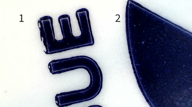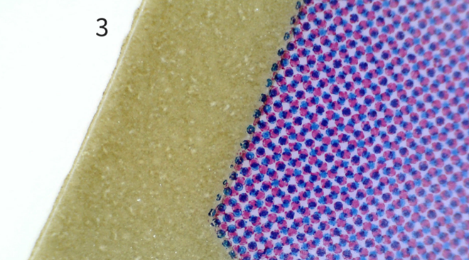 De uitlopende randen van het lijnwerk (1) vertellen mij dat deze LDPE folie is bedrukt in Flexo. Die keuze is op zich logisch, het zal een calculatie zijn geweest op basis van parameters: materiaal, volume en mogelijk de frequentie waarin het design aangepast wordt. Het is achterhaalde perceptie dat er met de flexo techniek mindere kwaliteit gerealiseerd kan worden. Dus ook daarom een terechte keuze.
