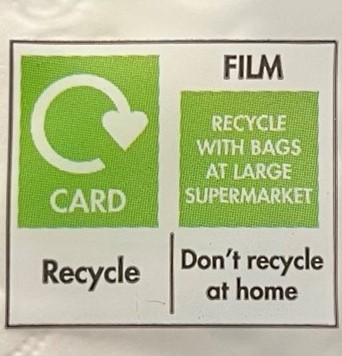 Eens kijken naar het symbool voor afvalverwerking. Het rechtergedeelte (FILM) snap ik: dit product komt namelijk uit een Engelse supermarkt. In verreweg de meeste councils in de UK kan LDPE folie als deze niet bij de “kerbside” inzameling voor (hard) plastic, papier, karton, metaal en glas. Folies en bv. chips zakken worden bij gratie apart ingezameld bij collection points in de grotere supermarkten. Dat moet je als consument wel zelf doen. Wij doen dat thuis natuurlijk braaf, maar hoeveel consumenten doen dat in de UK? Ik heb de onderliggende data en ook de recycle rate na inzameling niet kunnen vinden, maar ben er wel benieuwd naar.